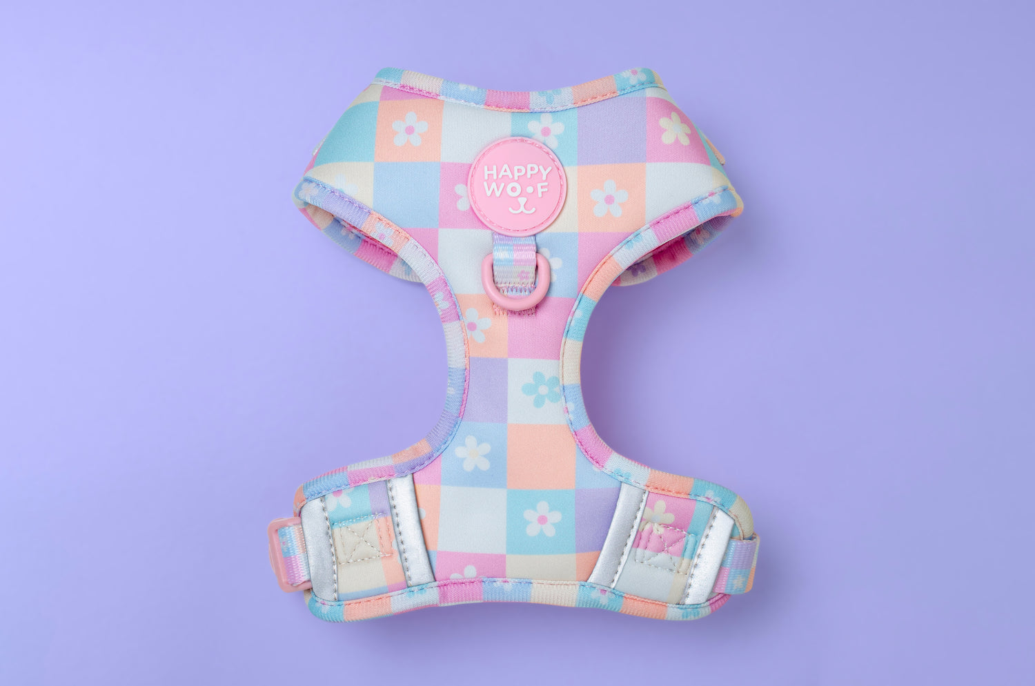 This charming design brings a touch of whimsy and fun to your daily walks. Featuring cheerful daisies and soft pastel checkers, this harness is perfect for the playful, adventurous pup.