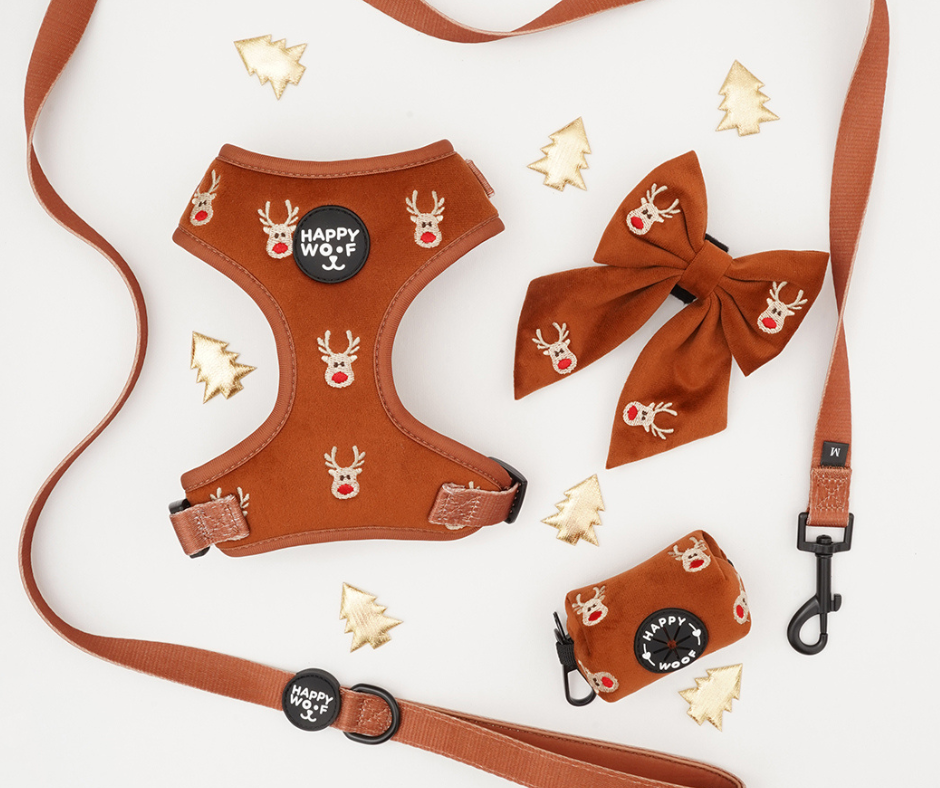 Crafted in plush velvet with intricate Rudolph embroidery, set against a warm chestnut brown background, this collection is made to bring cozy holiday vibes to every walk. The matching chestnut brown straps complete the look, balancing elegance with festive charm.